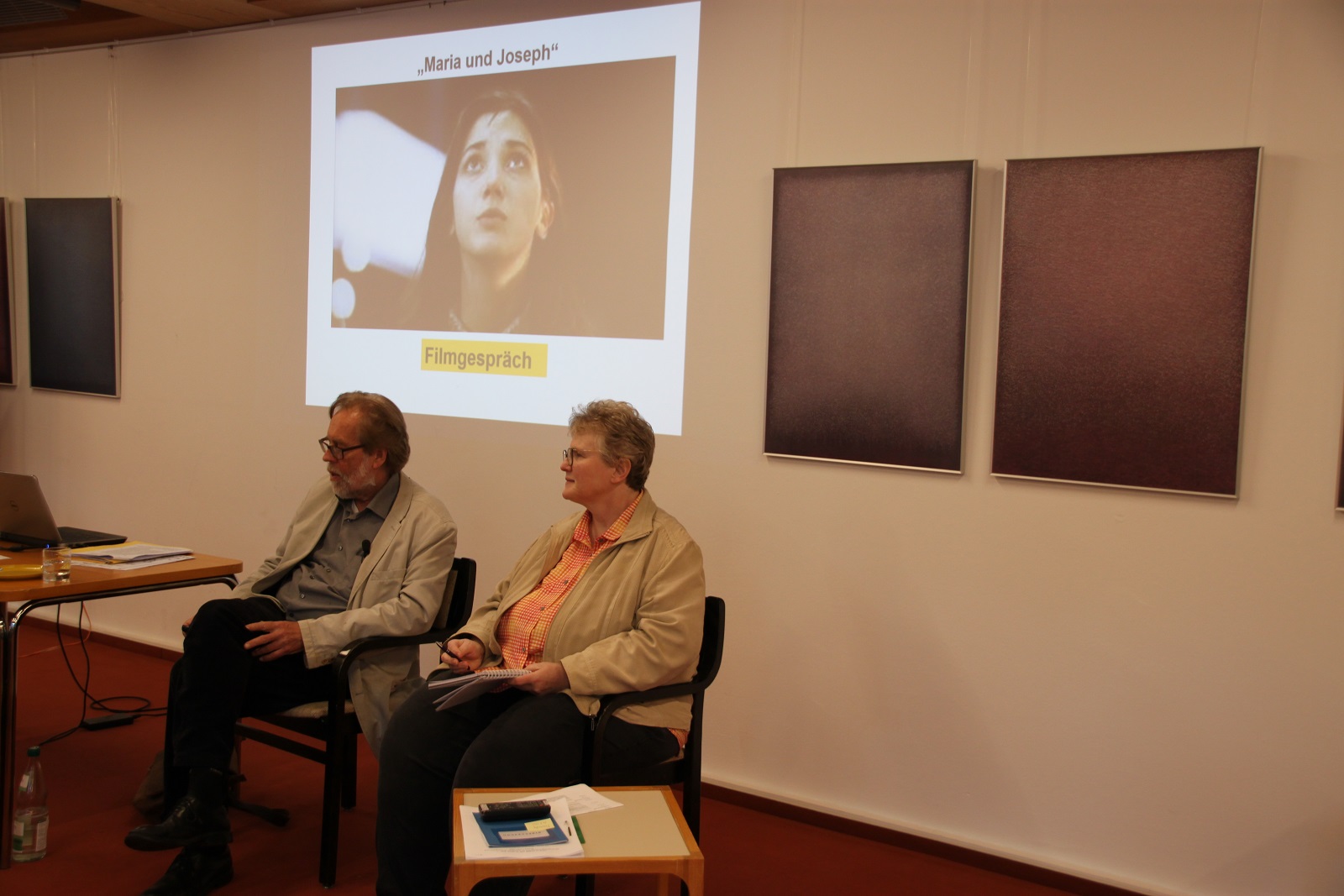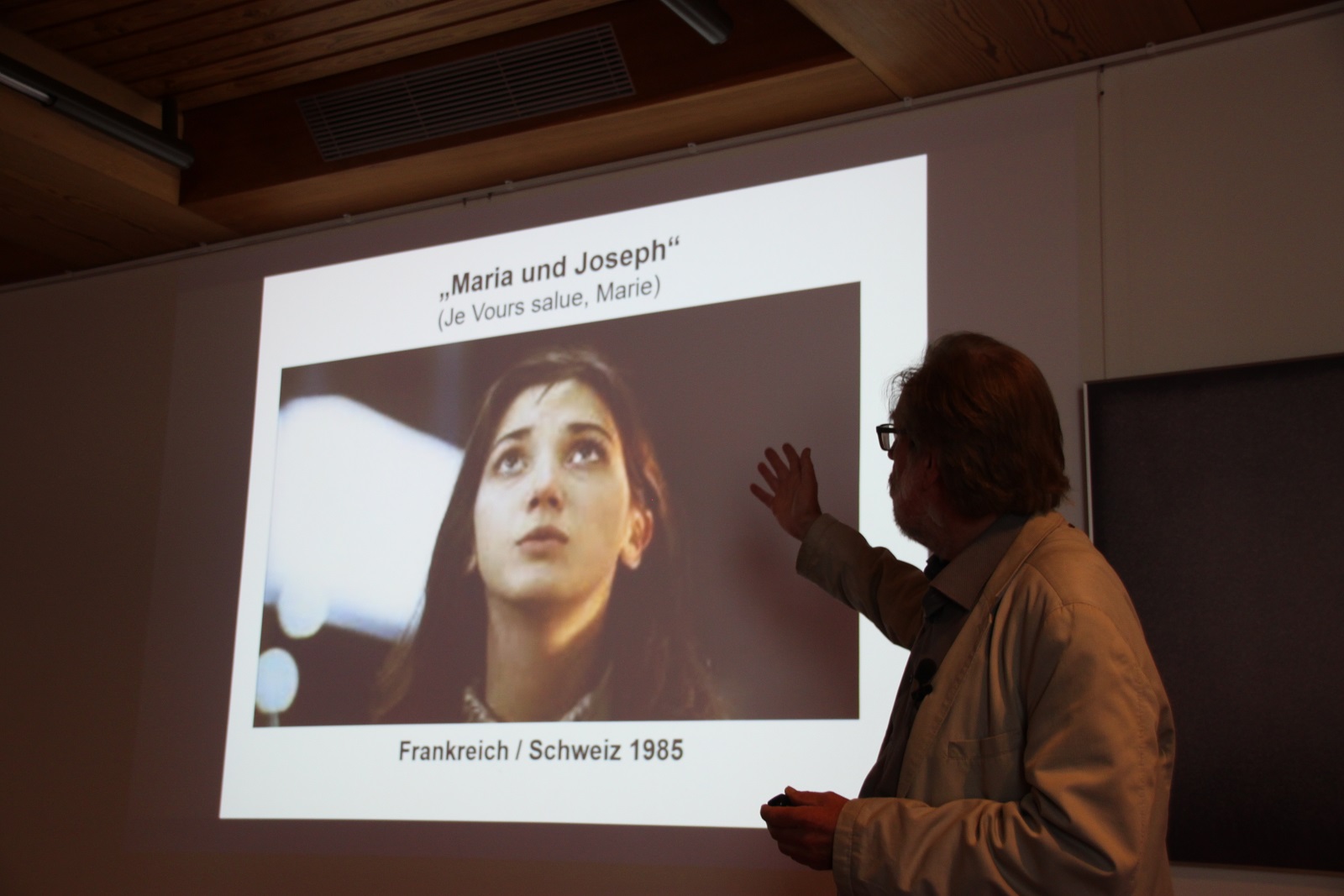 Teil des Programms war auch ein Spielfilm: MARIA UND JOSEPH“ (Regie: Jean-Luc Godard) (Schweiz/Frankreich: 1984). Ein anspruchsvoller Film, der die jungfräuliche Empfängnis und die Beziehung von Maria und Joseph ins 20. Jahrhundert überträgt und eher eine Collage darstellt. Der Film irritiert dadurch, dass er die jungfräuliche Empfängnis nicht hinterfragt, sondern als Geheimnis akzeptiert und stehen lässt. Mithilfe einer qualifizierten Hinführung von Prof. Zwick, der u.a. auf eine „Ästhetik der Unterbrechung“ (Zwick) im Film von Godard aufmerksam machte, erwies sich der Film als sehr lohnend. Ein konstruktives Filmgespräch schloss sich an.