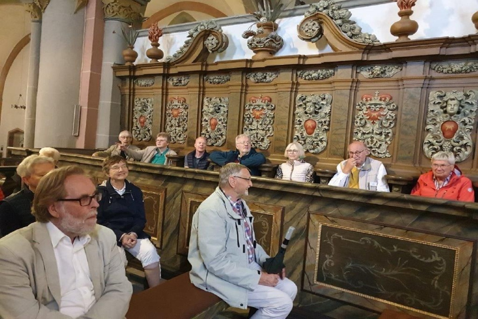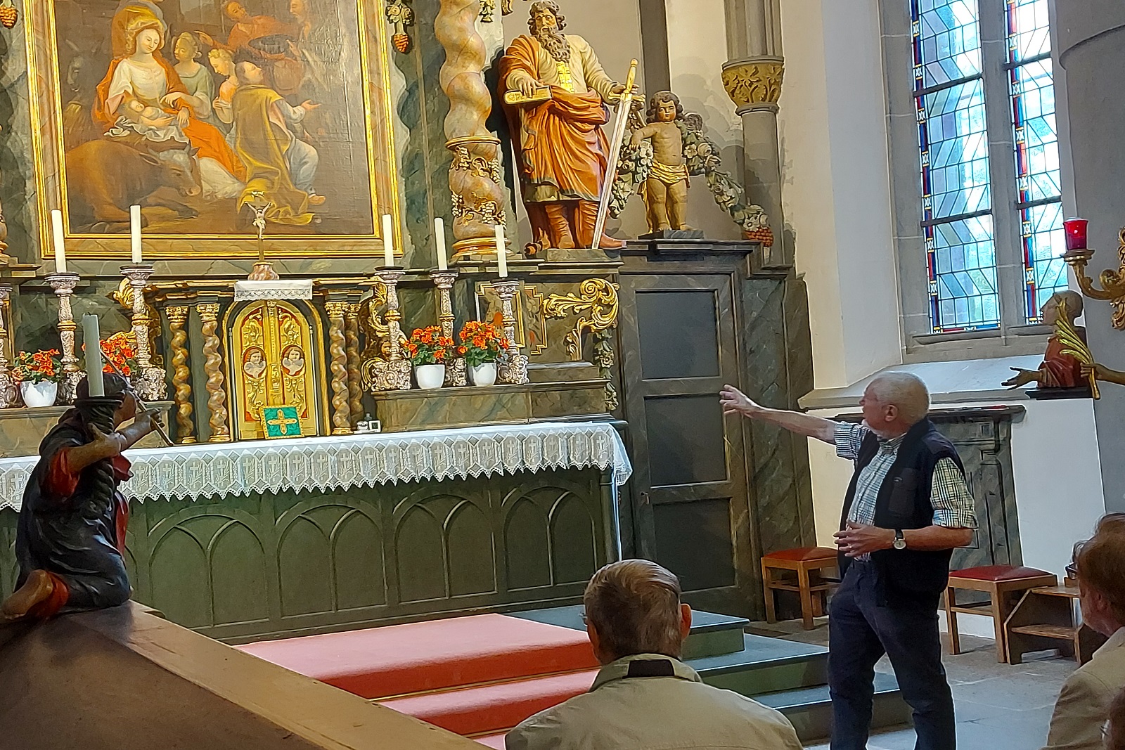 Ergänzt wurde das Programm durch eine Exkursion zur Stiftskirche von Obermarsberg, gegründet im 8. Jhd. von Karl dem Großen als Klosterkirche eines Benediktinerkonvents. Eine Führung durch Hermann Runte vermittelte außerordentlich kenntnisreich die Geschichte dieses Ortes. Die Besichtigung mündete in einer gemeinsamen Betrachtung des zentralen Altarbildes aus der Werkstatt Papen, das die Geburt Christi darstellt. Dieses Gespräch fügte sich inhaltlich in das Thema der Bibelschule. Nach der Führung gab es Kaffee und Kuchen im Obermarsberger Heimatmuseum.