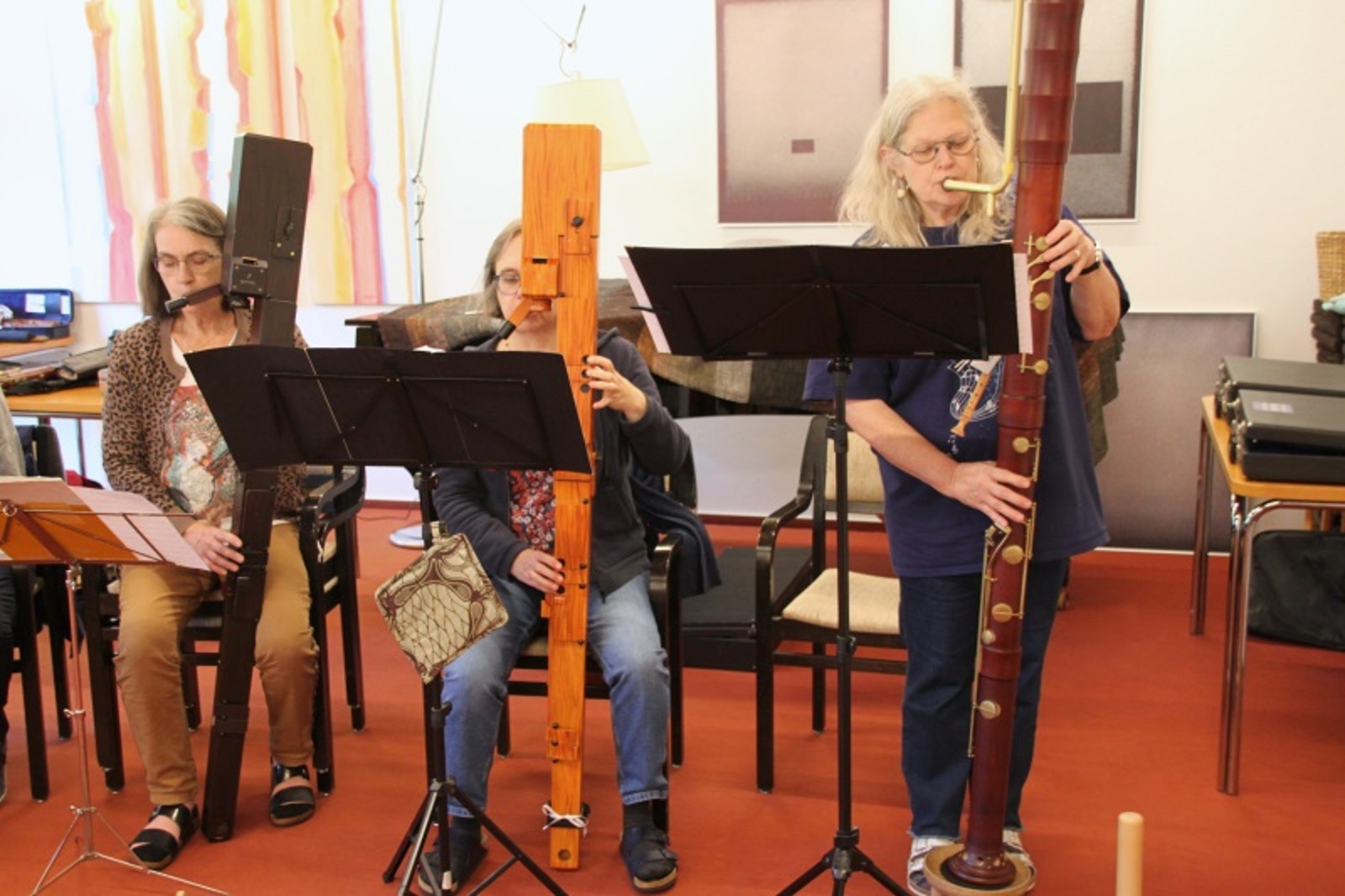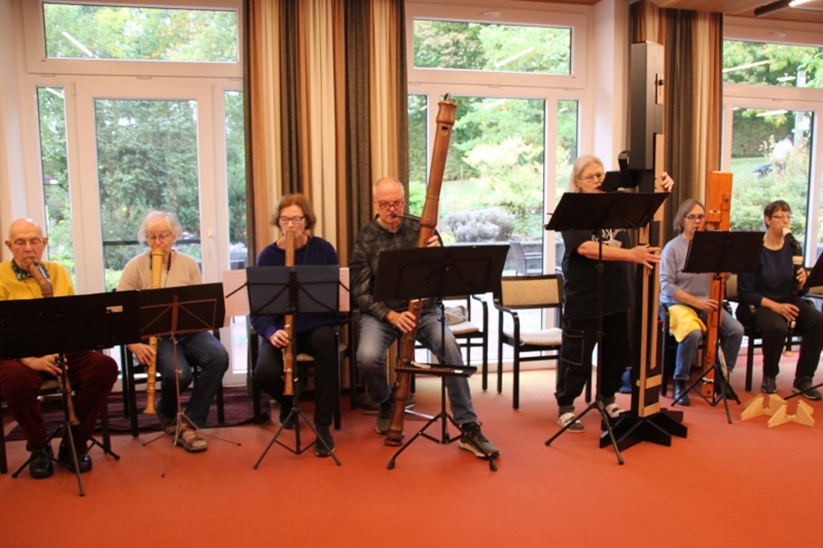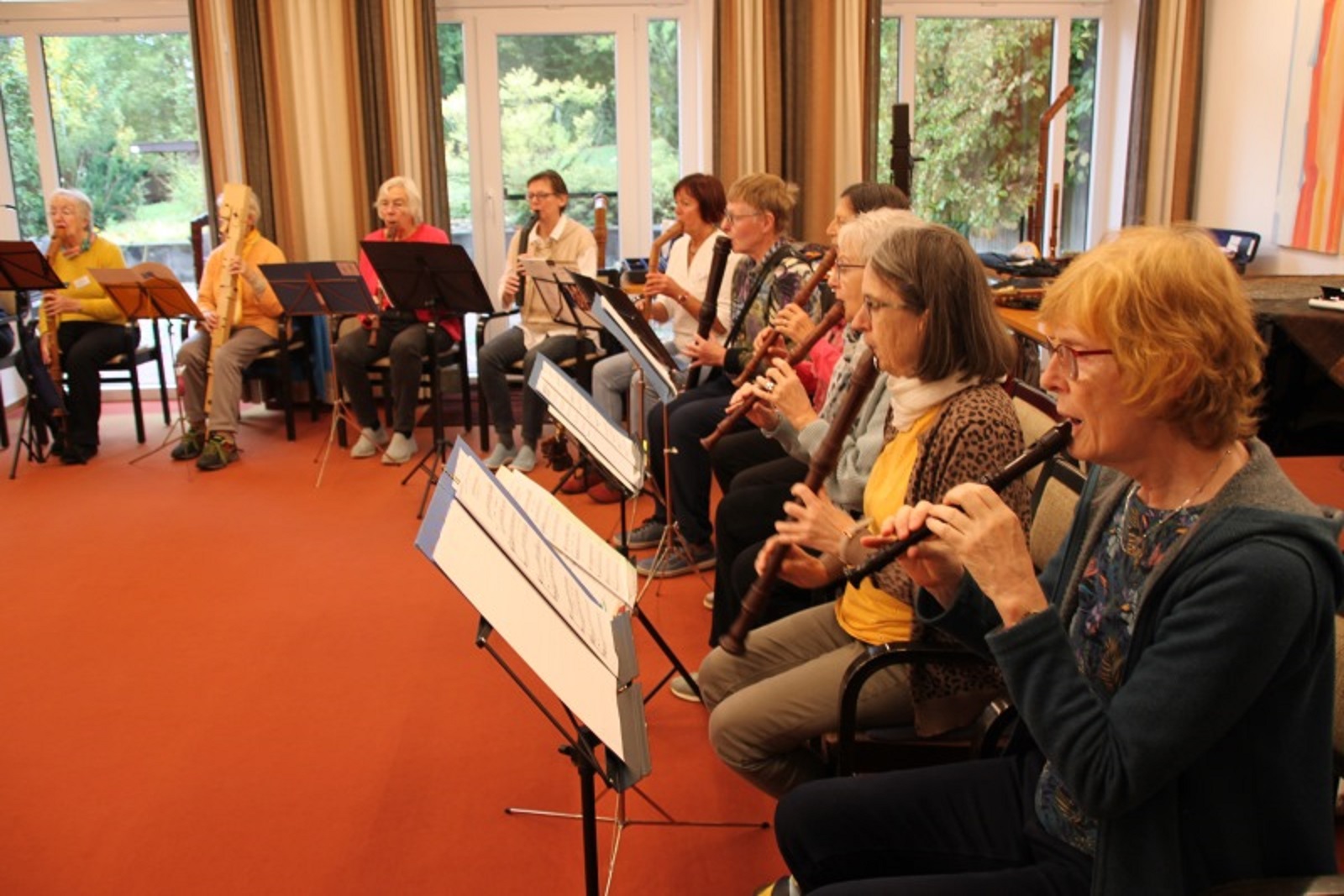 Zahlreiche versierte Blockflötistinnen und -flötisten folgten der Einladung und reisten mit großem Gepäck an. Sie beherrschten das Spiel des ganzen Blockflöten-Quartetts und brachten ihre Instrumente zum Kurs mit. Obendrein trugen einige ihre Subbass-Flöten mit etwa zwei Metern klingender Länge ins Bildungshaus. Ein bemerkenswertes Bild – ebenso wie an den Tagen ein eindrucksvolles Musikspiel.