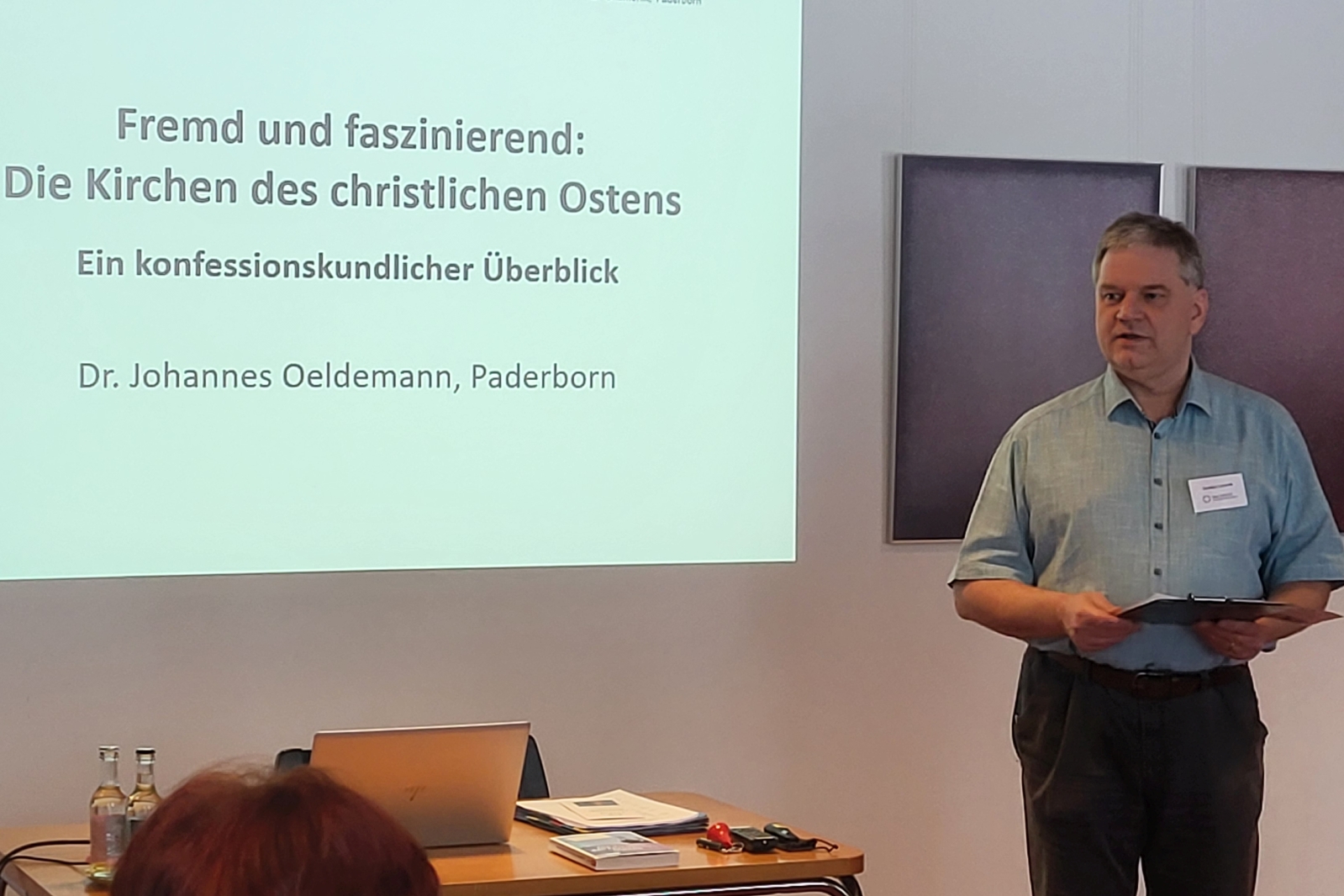 Dr. Johannes Oeldermann eröffnete die Tagung mit einer Einführung in die Vielfalt der Kirchen des christlichen Ostens als eine fremde und zugleich faszinierende Welt. Diese Welt kann sehr unterschiedlich wahrgenommen und eingeteilt werden – z.B. auf drei Kulturräume, vier Konfessionen oder auch fünf Ritusfamilien. Die Gemeinsamkeiten und Unterschiede dieser Einteilungen sind durch komplexe geschichtliche Entwicklungen begründet und machen einem Außenstehenden die Dynamiken und Verflechtungen innerhalb der Orthodoxie nur schwer nachvollziehbar. Neben einer kognitiven Auseinandersetzung mit der Vielfalt der Kirchen ist daher eine persönliche Begegnung mit orthodoxen Christinnen und Christen von entscheidender Bedeutung, betonte der Referent zum Abschluss seiner Ausführungen. Gelegenheiten dazu gebe es in Fülle und Hülle, denn die orthodoxen Gemeinschaften in Deutschland wachsen aus den vorhandenen Infrastrukturen heraus und erhalten hier und da ein Gastrecht in evangelischen wie katholischen Gemeinden.