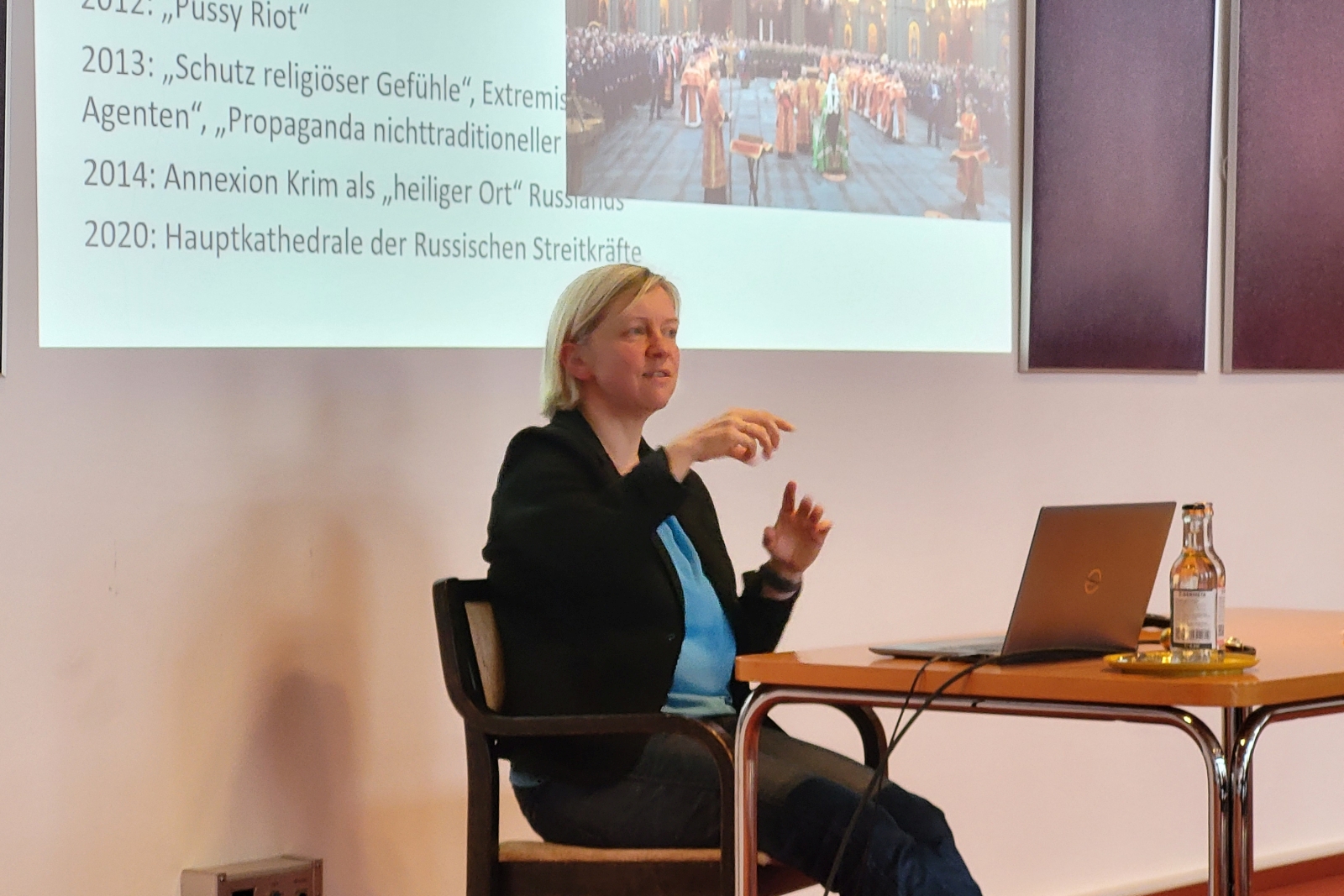„Die Russische Orthodoxe Kirche spielt gegenwärtig eine Rolle in Politik und Gesellschaft, die wir nicht mehr für möglich gehalten hatten“. Mit diesem Satz begann die sehr aufschlussreiche Analyse von Prof. Regina Elsner zu aktuellen Entwicklungen innerhalb der größten orthodoxen Glaubensgemeinschaft am Nachmittag. Die Referentin machte deutlich, wie wichtig das Verständnis der politischen und wirtschaftlichen Entwicklungen in den 90er Jahren für diese Entwicklungen ist. Die Religion ist nach dem Wegfall vieler sinnstiftender Narrative aus der Sowjetzeit zu einer Ersatzideologie geworden und die imperiale Identität wurde zum Garanten für den Schutz des Glaubens. Die Referentin konnte aber auch von oppositionellen Gruppen und Äußerungen im kirchlichen Kontext zu berichten. Im weiteren Verlauf des Nachmittags erörterte Prof. Elsner anhand von vier Beispielen (Belarus, Estland, Lettland, Ukraine) wie unterschiedlich die teilweise unabhängigen orthodoxen Kirchen das Verhältnis zum eigenen Staat und die Zugehörigkeit zum Moskauer Patriarchat in der Praxis gestalten. Am Abend wurden anhand von zwei Texten das Spannungsverhältnis innerhalb der Orthodoxie und das nahezu verzweifelte Bemühen um eine gemeinsame Sprache der orthodoxen Kirchen angesichts des Kriegsgeschehens in der Ukraine unter der Leitung von Prof. Elsner in der Gruppe diskutiert.