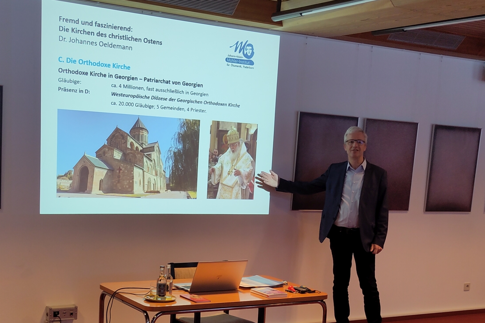 Am Sonntag stand ein etwas erfreulicheres Thema auf dem Programm – der ökumenische Dialog zwischen der katholischen Kirche und den orthodoxen Kirchen. Dr. Oeldemann zeichnete die geschichtliche Entwicklung der Beziehung zwischen den Kirchen im Osten und im Westen in vier Phasen auf: Kirchengemeinschaft (1.-5. Jh.), Entfremdung (5.-13. Jh.), Konfrontation (13.-19. Jh.) und Wiederannäherung (20.-21. Jh.). Mehrere einzelne Vereinbarungen und Erklärungen wurden vorgestellt, darunter die Wiener Christologische Formel, welche die Überwindung vieler strittiger Punkte und das Beilegen historischer Verwerfungen markieren. Entscheidend ist dabei der Wille, aufeinander zuzugehen und ein Verständnis für die Position des anderen zu entwickeln, auch wenn am Ende eine „logische Widersprüchlichkeit“ in der gemeinsamen Erklärung stehen bleibt. Neue, sehr aktuelle Impulse aus Rom wie das Studiendokument zur Rolle des Bischofs von Rom in der Ökumene machen Hoffnung auf noch mehr Gemeinsamkeit in der kirchlichen Praxis in der Zukunft.