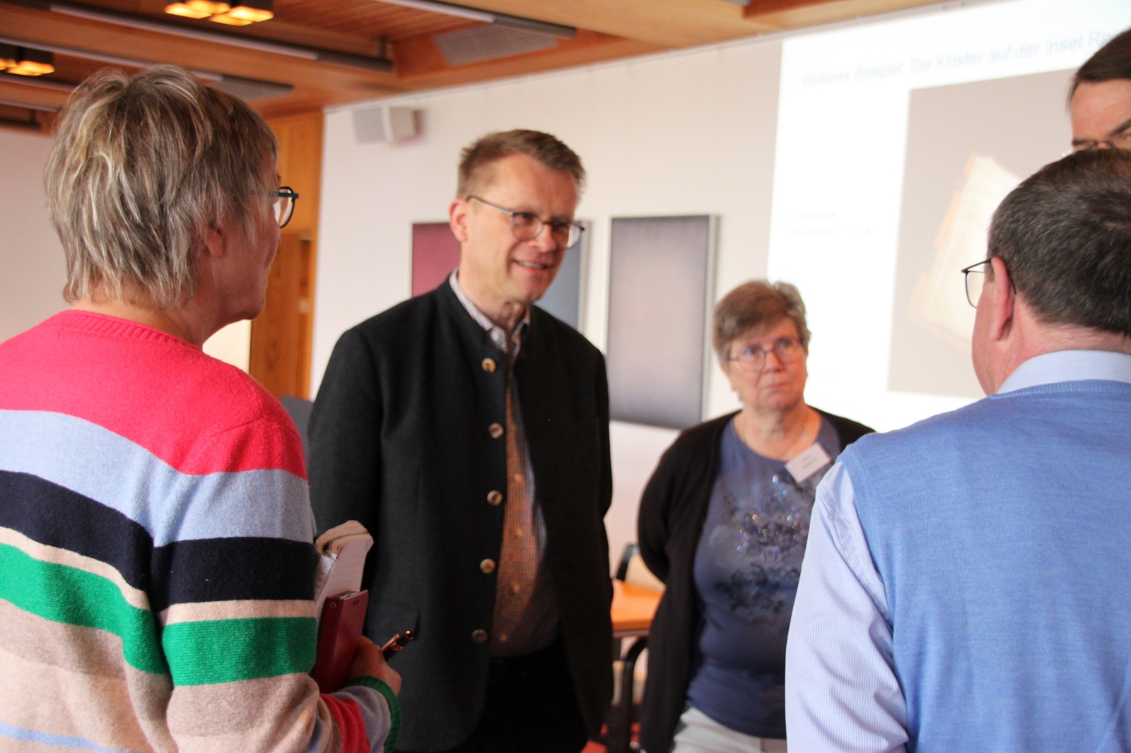 Den zweiten Seminartag gestaltete der katholische Theologe und Liturgiewissenschaftler Prof. Dr. Stefan Böntert aus Bochum. Unter dem Titel „In Vielfalt und Einheit“ skizzierte er Ordensgemeinschaften als Orte liturgischer Praxis: Dabei wurde herausgearbeitet, welch erstaunliche Vielfalt liturgischer Praxis (z.B. im Stundengebet) in der mannigfaltigen Klosterkultur durch die Jahrhunderte – allen Versuchen zur Vereinheitlichung zum Trotz – entstanden ist und bis heute gepflegt wird. In einem weiteren Schritt wurde aufgezeigt, welche Herausforderungen entstehen, wenn Ordensgemeinschaften sich neu orientieren müssen. Reform- und Erneuerungswillen, ein neues Kirchenbild und veränderte Gemeinschaftsstrukturen prägen Liturgie und modernen, der Gegenwart angepassten Kirchenbau. An Beispielen gelungener Um- und Wiederbelebungen wurde gezeigt, welche Chancen Umnutzungen und zeitgenössische Eingriffe bieten (können).