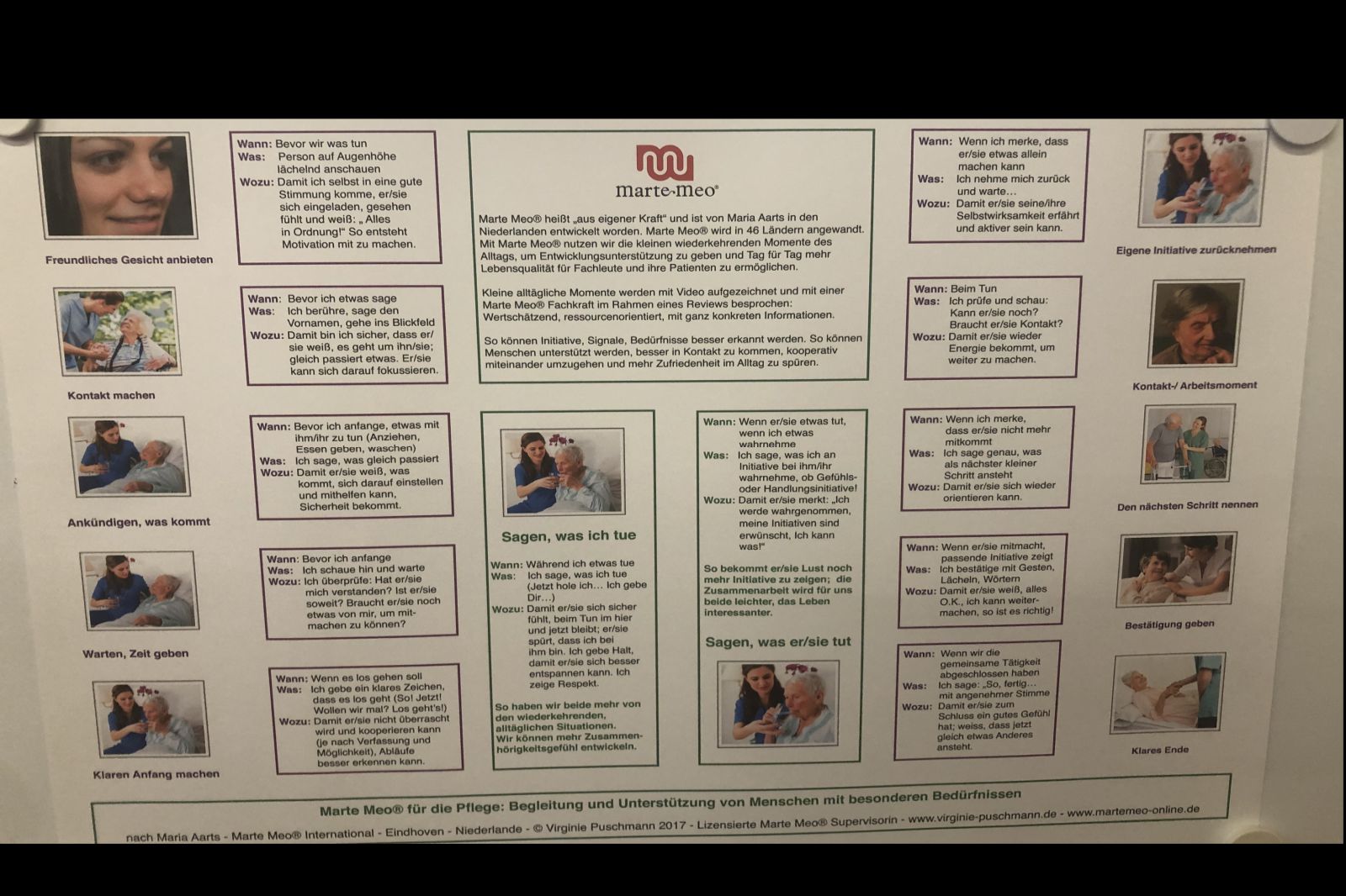 Am dritten Tag erläuterte sie, was es mit Marte Meo von Maria Aarts auf sich hat. Übersetzt heißt Marte Meo „aus eigener Kraft“. Ursprünglich wurde Marte Meo für Eltern entwickelt, ist aber inzwischen auch im Bereich Pflege und Hospizbegleitung angekommen. Dabei werden Alltagssituationen gefilmt und dahingehende untersucht, worauf ein gelingendes Miteinander basiert. Wichtig sind ein Lächeln und die bewusste Wahrnehmung von schönen Momenten. Mit Filmsequenzen aus dem Pflegebereich wurde deutlich, was schon kleine Veränderungen bewirken können.