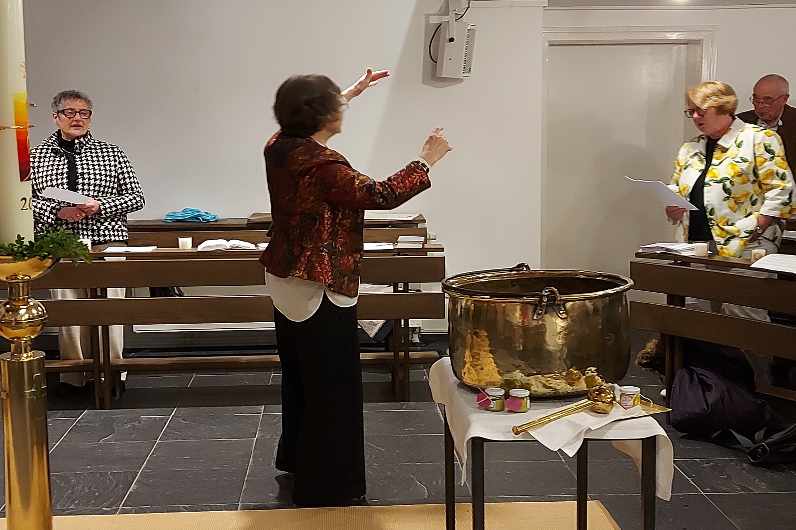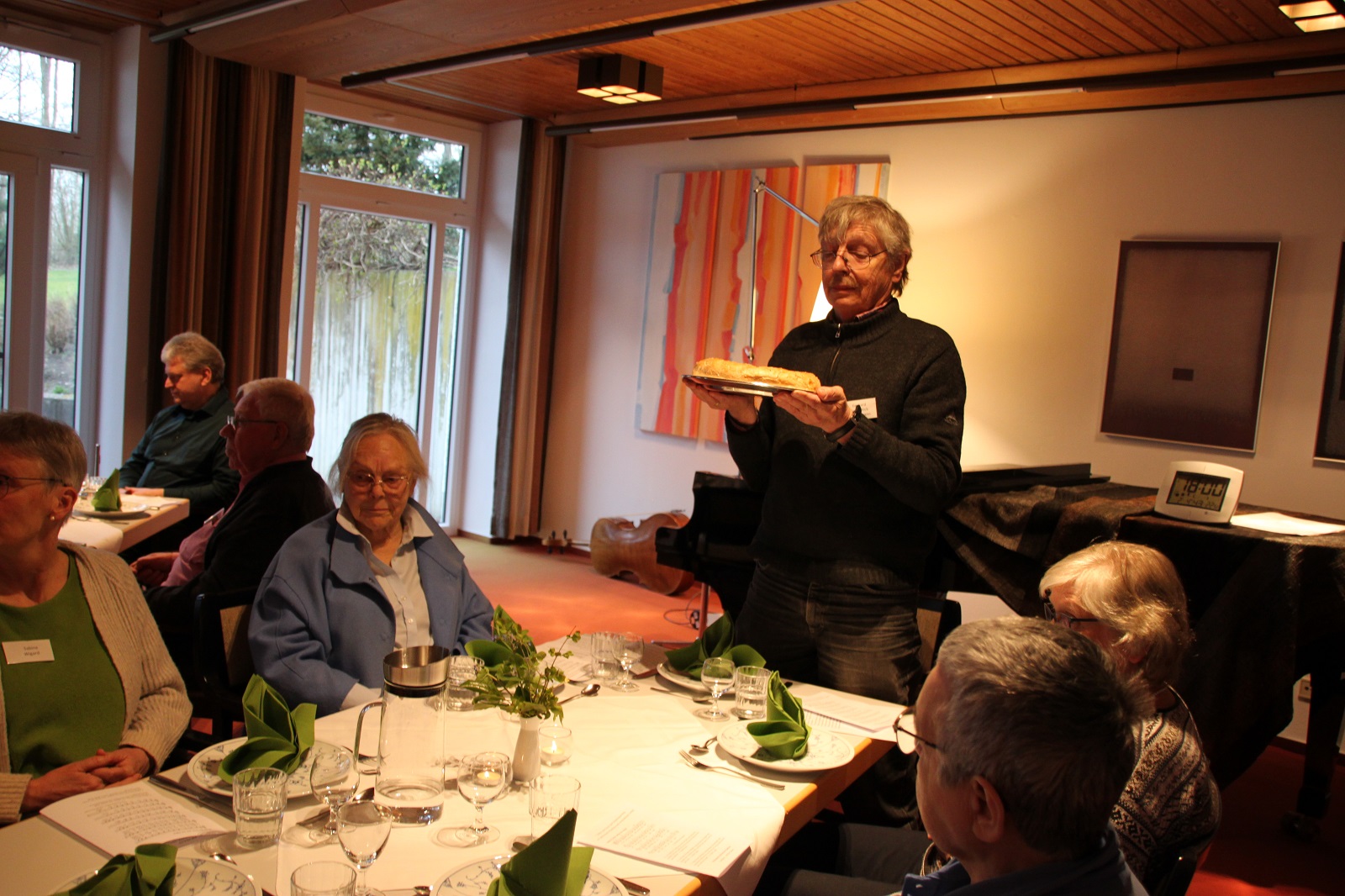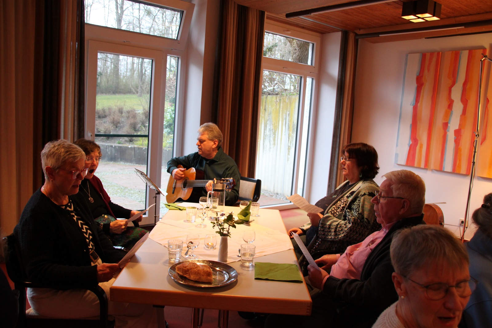 Am Nachmittag standen gemeinsame Vorbereitung und Singeprobe für die Mahlfeier im Zentrum. Die Mahlfeier selbst war dann ein Fest der Gemeinschaft: Sie fand an sieben Tischen statt, musikalisch getragen von Monika Kasper, Josef Verwimp, Marianne Stommel und Damian Lazarek mit Tafelmusik und Festleuchter, Schrifttexten, Schriftgespräch, Gebet und Gesang. Das Essen war lecker, es wurde von Tischdiener*innen aufgetragen, jede Speise wurde gesegnet, die Stimmung war fröhlich und zugleich andächtig.