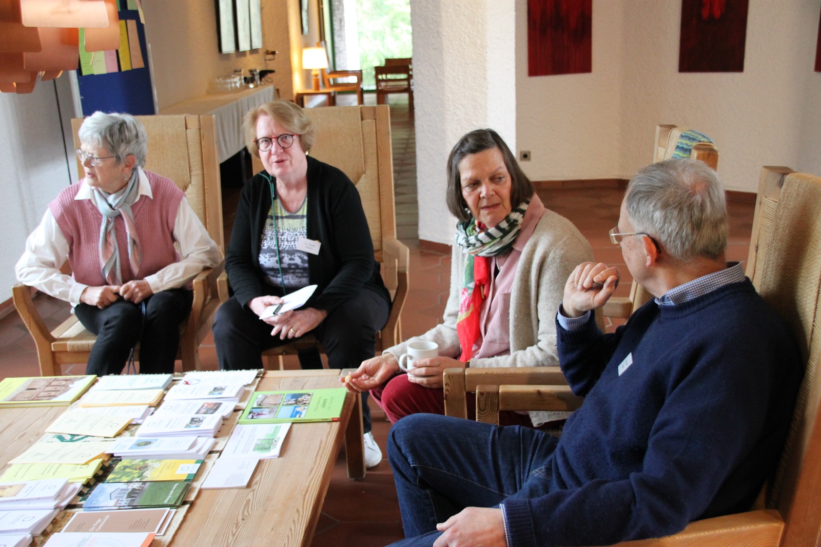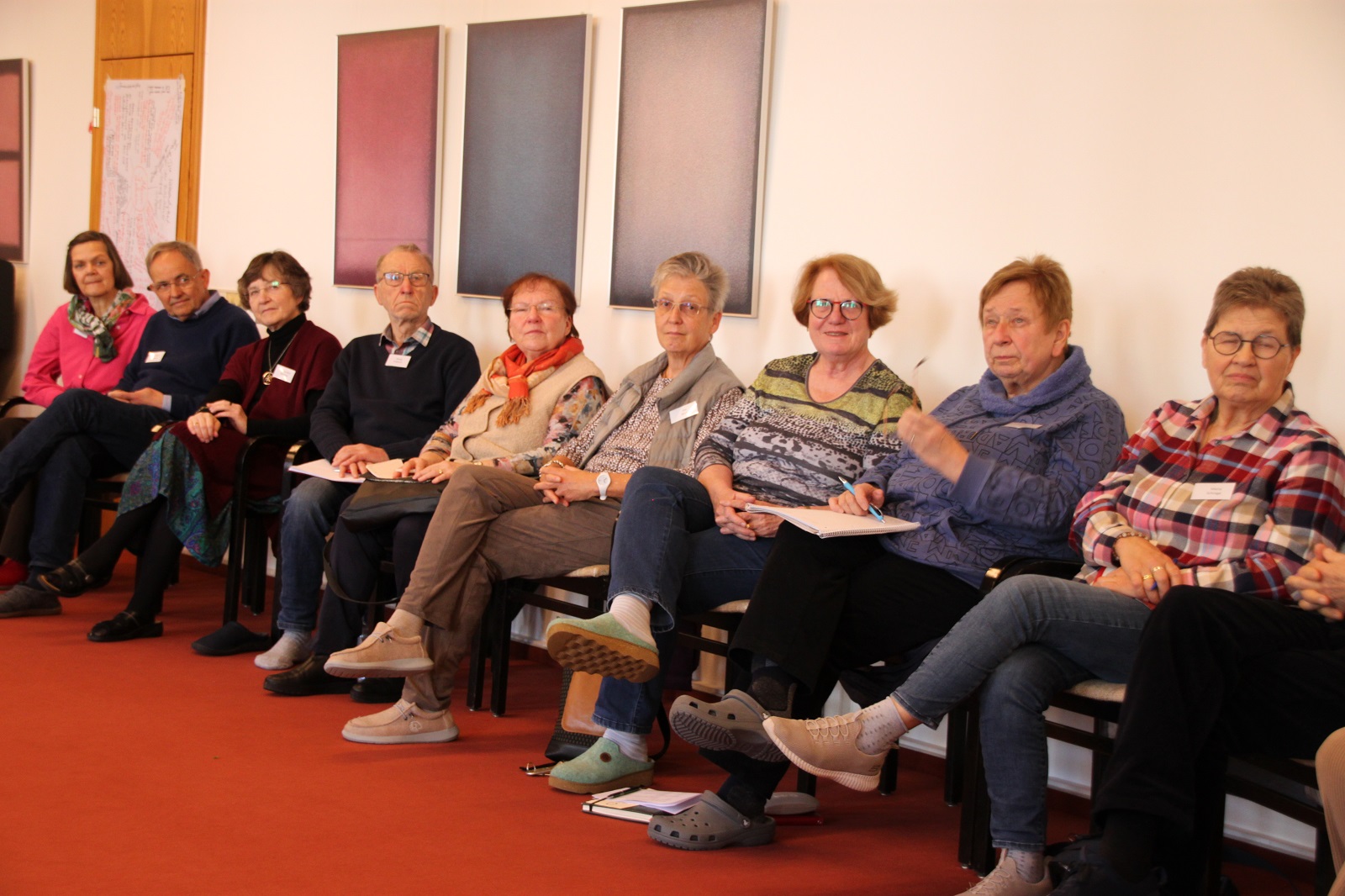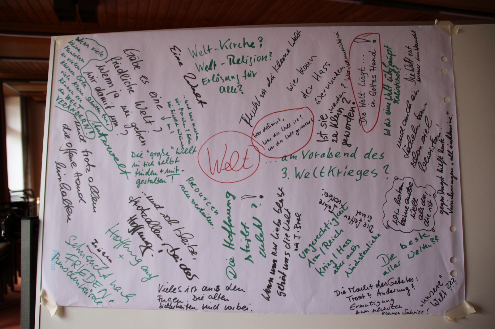Am Mittwochabend begann das Seminar mit einer Einstiegsübung, die sofort eine Atmosphäre des Zuhörens und der Präsenz schuf. Unter der Anleitung von Pastor Ulli Auffenberg fand eine Schreib-Meditation statt: Im großen Vortragsraum waren in den vier Ecken Tische mit Flipchartbögen und Stiften aufgestellt, die jeweils einem Thema gewidmet waren — Meine Anfragen/Nöte bezüglich der Welt, bezüglich mir selbst, bezüglich der Kirche und bezüglich Natur und Umwelt. Die Teilnehmenden bildeten vier Gruppen und durchliefen schweigend die Ecken, schrieben ihre Gedanken, Sorgen und Hoffnungen nieder und hinterließen so ein vielstimmiges Netz aus persönlichen Eindrücken.