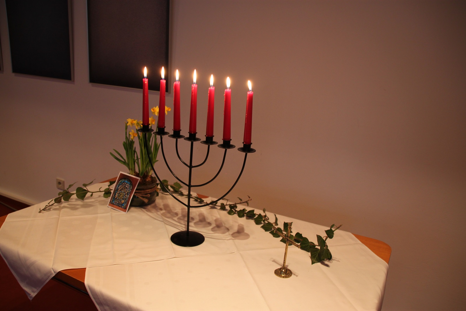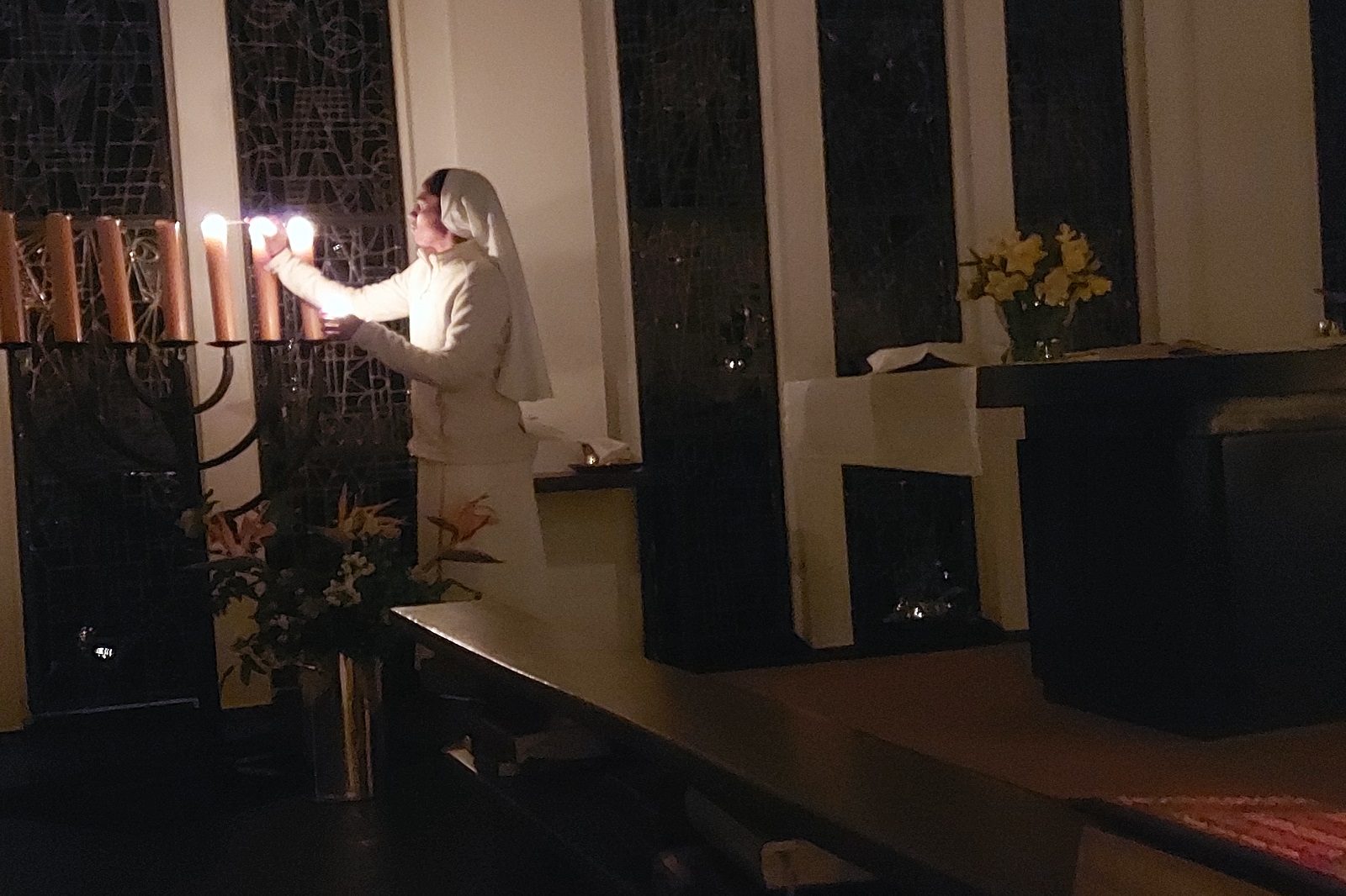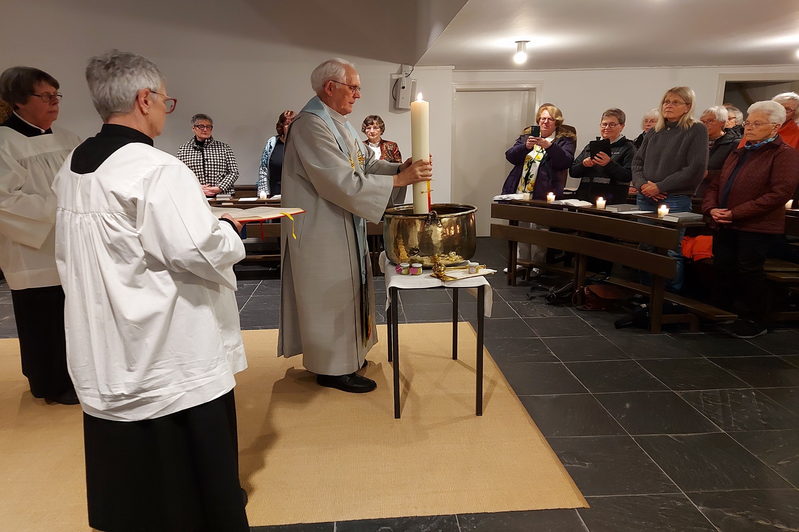 Die Osternacht war dann sehr feierlich; externe Gäste bereicherten die Feier. In der Predigt gab Pastor Auffenberg einer Teilnehmerin des Bibliodrama-Workshops Raum, von ihren Erfahrungen zu berichten. Nach der Kommunion segneten sich die Teilnehmenden im großen Kreis gegenseitig mit der selbst hergestellten Salbe.