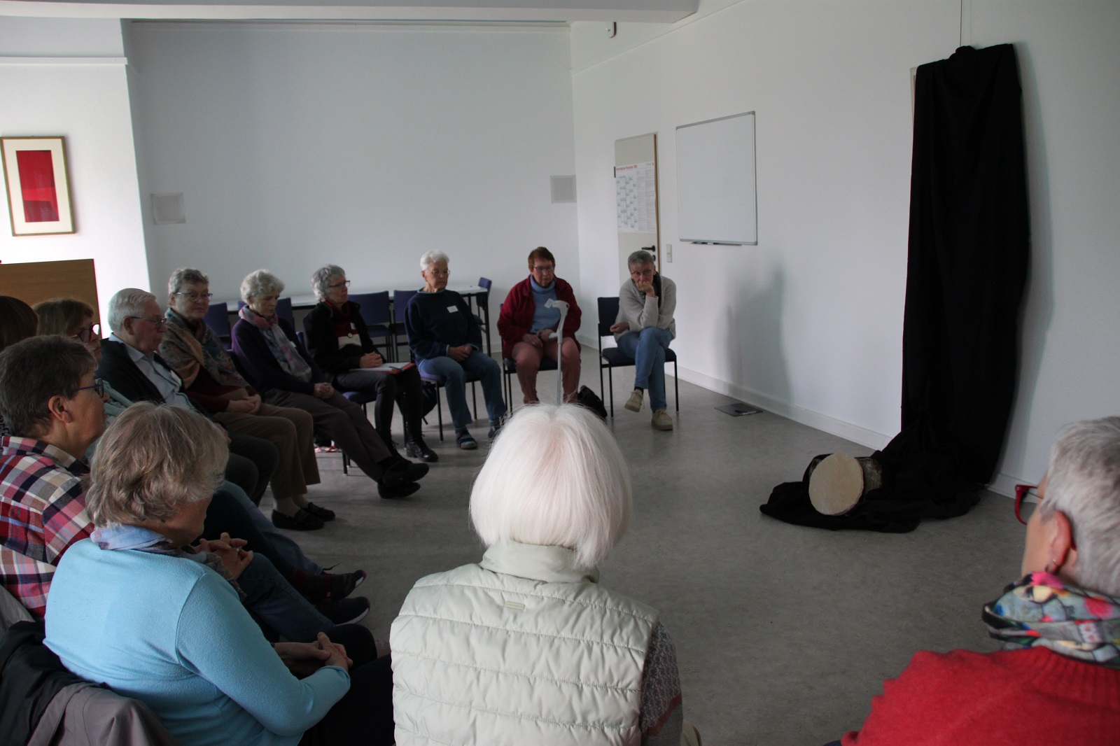 Der Gründonnerstag begann im Freien mit dem Ulmentanz — ein lebendiger, gemeinschaftsbildender Auftakt, der Geist und Körper in Einklang brachte. Zurück im Raum griff Pastor Auffenberg die zuvor in den vier Ecken gesammelten Stichworte erneut auf und leitete ein offenes Plenumsgespräch, das Verbindungen zwischen den persönlichen Anliegen und den größeren Themen der Kar- und Ostertage herstellte.