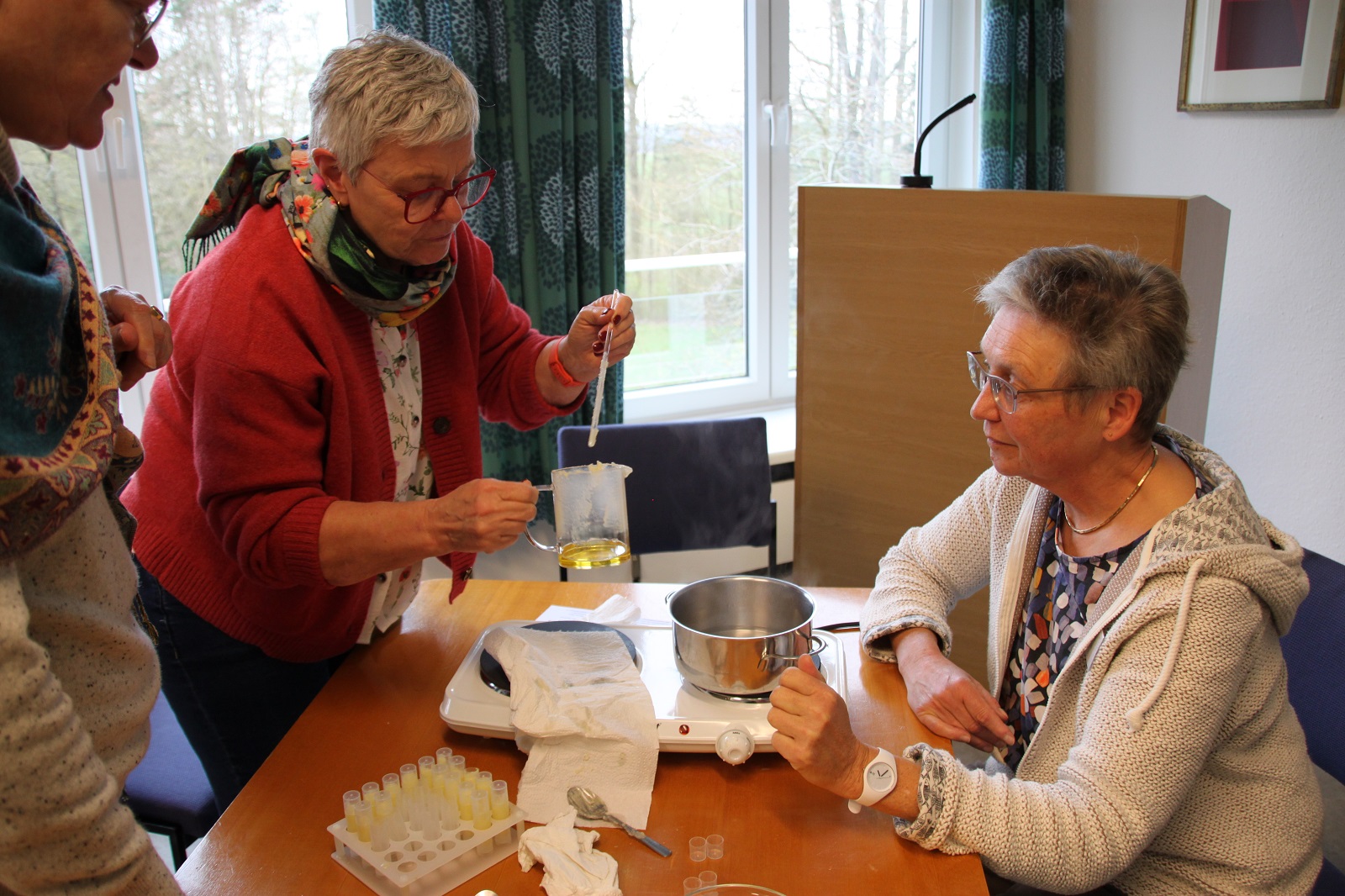 Am Nachmittag lud Kerstin Mettgen, Kräuterexpertin aus Borgentreich, zu einem besonderen, sehr gut vorbereiteten Workshop zur Salbenherstellung ein. Hier ging es um praktisches Tun mit den Händen. Hilfreich waren ihr fachliche Erklärungen und die Auswahl biblischer Kräuter. Pastor Auffenberg hatte zuvor betont, dass die selbst hergestellten Salben in der Osternacht gesegnet und verwendet werden sollten. Die Resonanz auf diese Einheit fiel sehr positiv aus.
