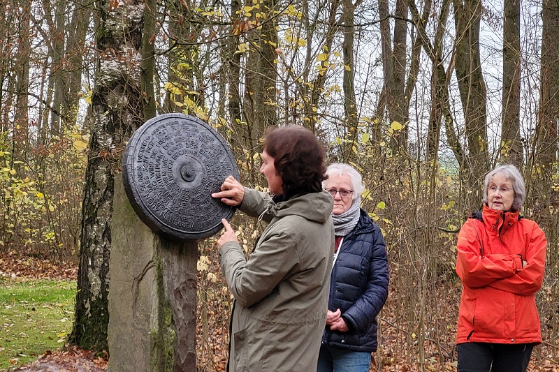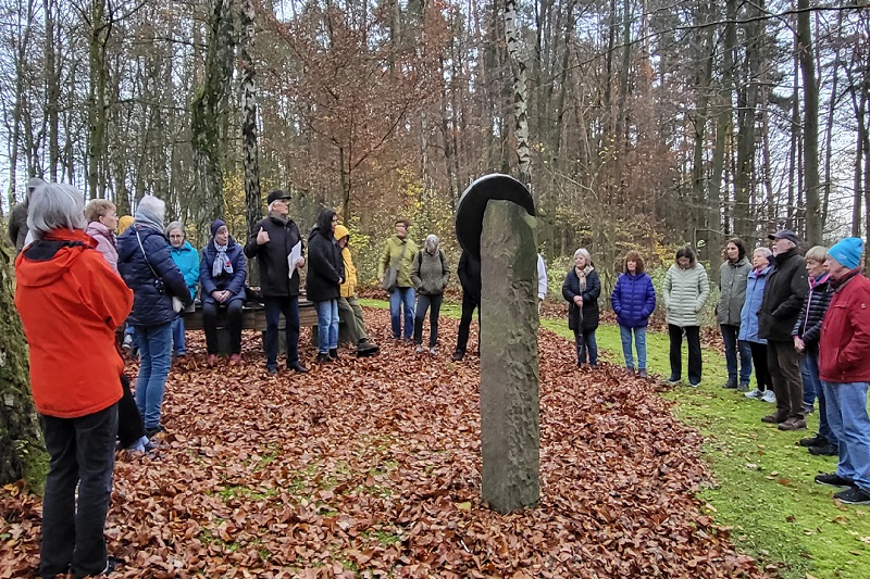 Am Samstagnachmittag hat sich Ullrich Auffenberg mit den Teilnehmer*innen auf den ersten Weg zur Gelassenheit, dem Los-Lassen zur Meister-Eckhart-Station des HEGGE-Parks begeben. Eine wichtige Voraussetzung für das Los-Lassen, ist ein Anker-Punkt in meinem Leben (das Wagenrad), das zugleich mein Haltepunkt ist. Je näher ich mich mit anderen verbunden fühle, desto stabiler, desto gelassener.