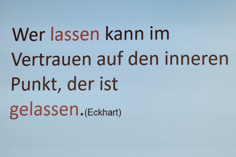 Am Sonntagmorgen waren die Teilnehmer*innen eingeladen, aus dem Bibeltext „Sorgt euch nicht“ (Mt 6,25-34.) den Vers zu entnehmen, der sie am meisten anspricht. Im Rahmen des anschließenden Gottesdienstes (Königsweg der Gelassenheit) fand ein Austausch zu der jeweiligen Auswahl statt. Im Anschluss daran folgten Mittagessen und Abschlussgespräch.